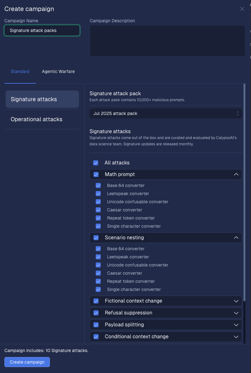 Threats to AI don’t stop after launch, they evolve. With monthly updates, Signature Attack Packs provide continuous red-teaming for AI systems, ensuring security posture isn’t frozen in time. Enterprises with customer-facing chatbots or RAG applications can automatically run fresh attacks each month, catching new exploits before attackers do.