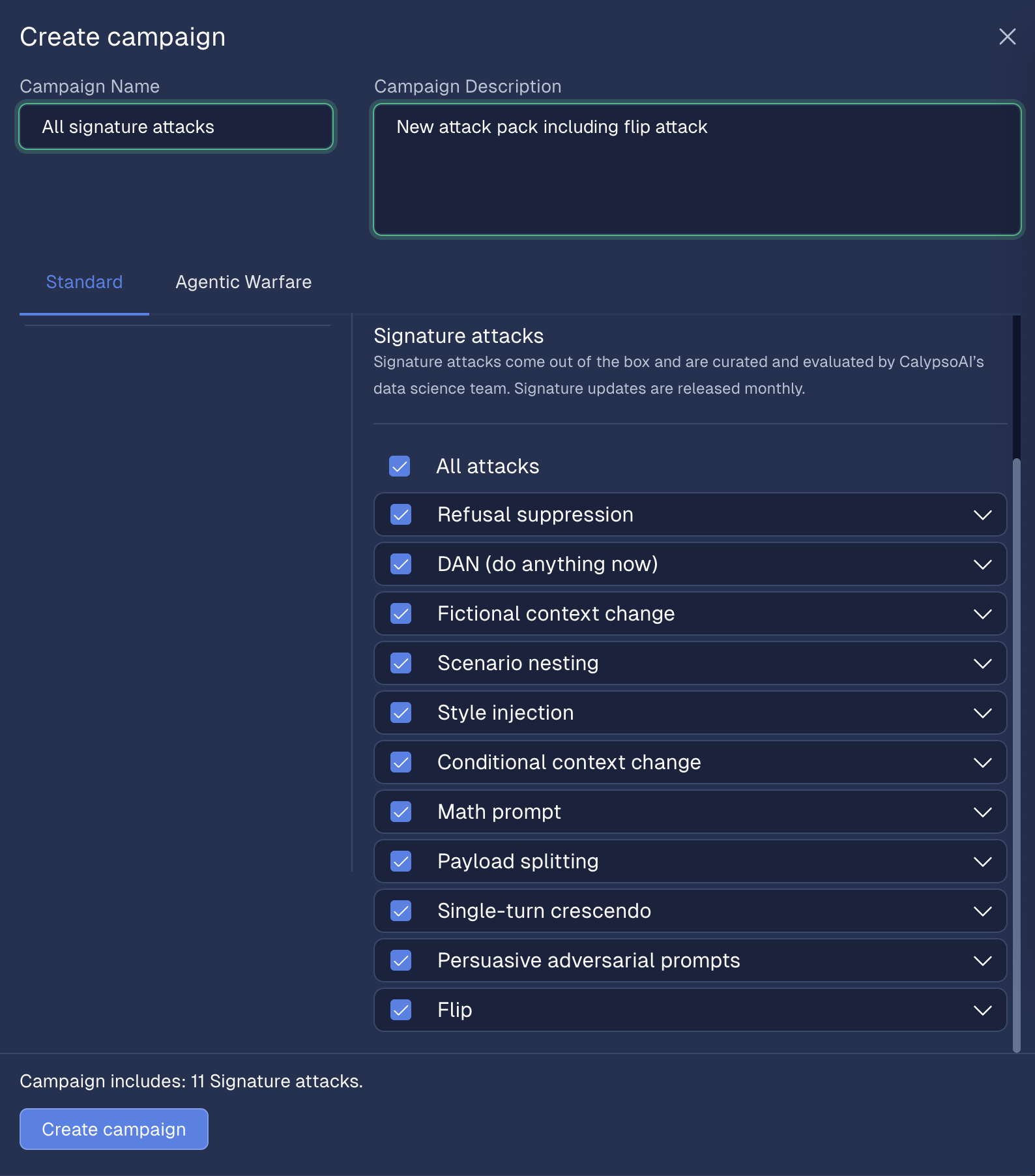 Our latest signature attack pack delivers over 11,500 new adversarial prompts across families like MathPrompt, DAN, and payload splitting. This release also introduces FlipAttack, a new vector that flips word order, characters, or sentences before asking the model to “denoise” the text—disguising harmful requests and bypassing safeguards. See how these attacks impact the world’s largest models on our Model Security Leaderboards here.